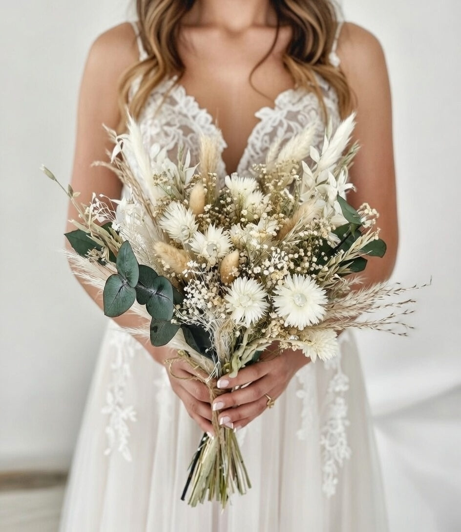 Our all-dried Natural Boho Bridal Bouquet combines rustic charm with elegance, perfect for country and relaxed wedding vibes. Handcrafted with Gypsophila, Ruscus, Bunny Tails, Corn, Cape Snow, and preserved Eucalyptus, this bouquet creates a soft, romantic look with natural textures and earthy tones. Designed to be both photogenic and a keepsake, it’s a bouquet that lasts long after your wedding day.