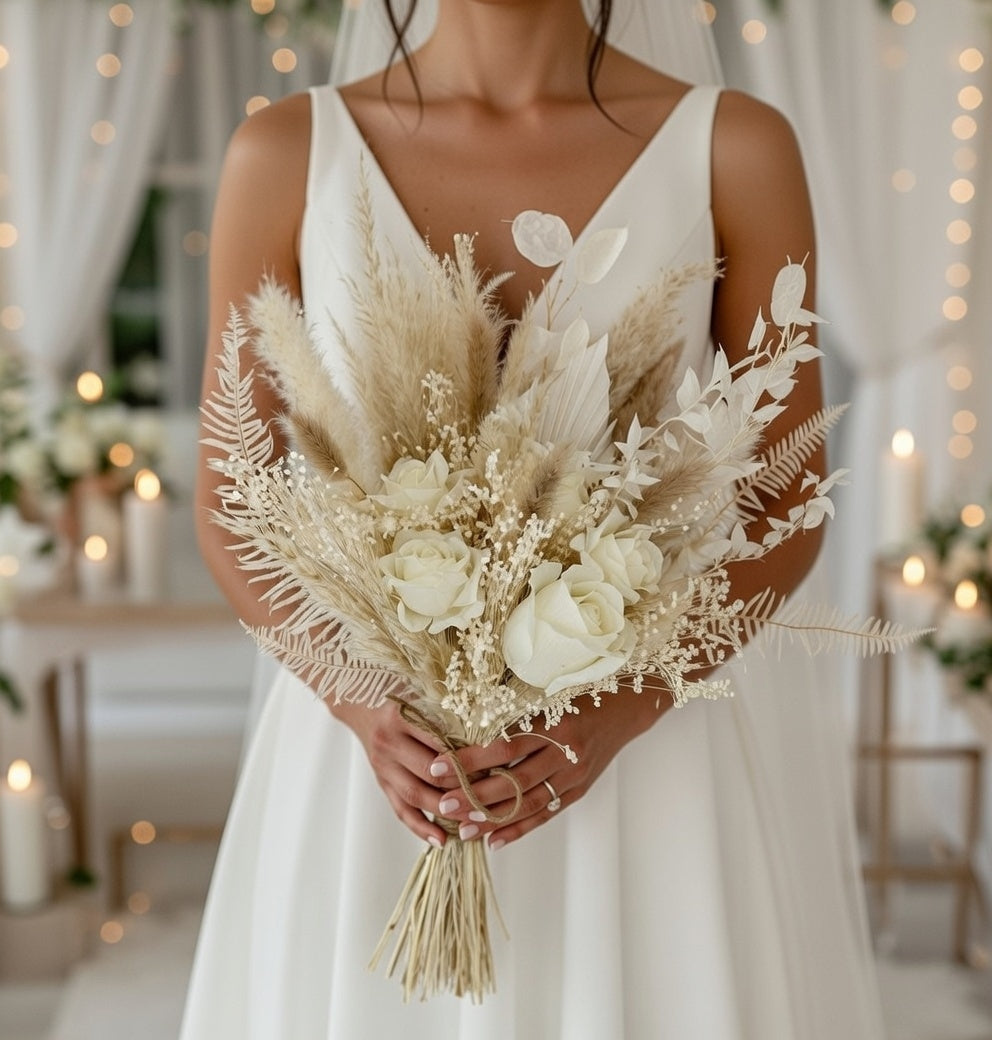 Timeless, elegant, and handcrafted, our White Wedding Range Bridal Bouquet is perfect for brides seeking refined luxury with a minimalist, all-white look. This bouquet features a sophisticated blend of white faux silk roses, pampas, ruscus, bunny tails, broom brush, honesty stems, and bleached ferns. The result is a soft, romantic arrangement that complements both summer and winter weddings, designed to be a lasting keepsake of your special day.