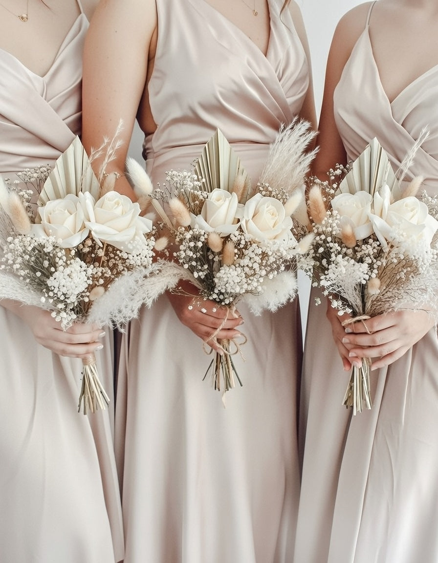 Chic and timeless, this Coco Dusk Bridesmaid Bouquet brings together palms, pampas, gypsophila, bunny tails, faux roses, and broom bloom. The mix of textures and soft dusky tones gives a modern yet rustic finish, pairing beautifully with satin or earthy-hued dresses. A smaller, lighter version of the bridal bouquet, it’s designed for bridesmaids to carry with ease while still echoing the glamour of the Coco Dusk Range.