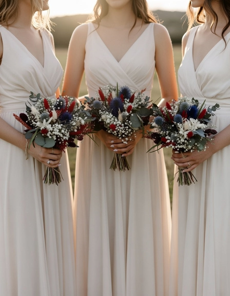 This beautiful dried Bridesmaid Bouquet is inspired by the rugged romance of the Scottish Highlands. Featuring a harmonious blend of Gypsophila, Eucalyptus, bold blue Thistles, Globe Thistles, coloured Corns, and soft Bunny Tails, it perfectly complements the bridal bouquet while standing out with its own rustic charm. With deep burgundy, emerald greens, and natural earthy tones enriched by the striking pop of blue from the iconic thistle, this bouquet is both graceful and characterful. Designed to be slightly smaller and lighter than the bridal bouquet, it ensures your bridesmaids carry something elegant, practical, and photogenic.